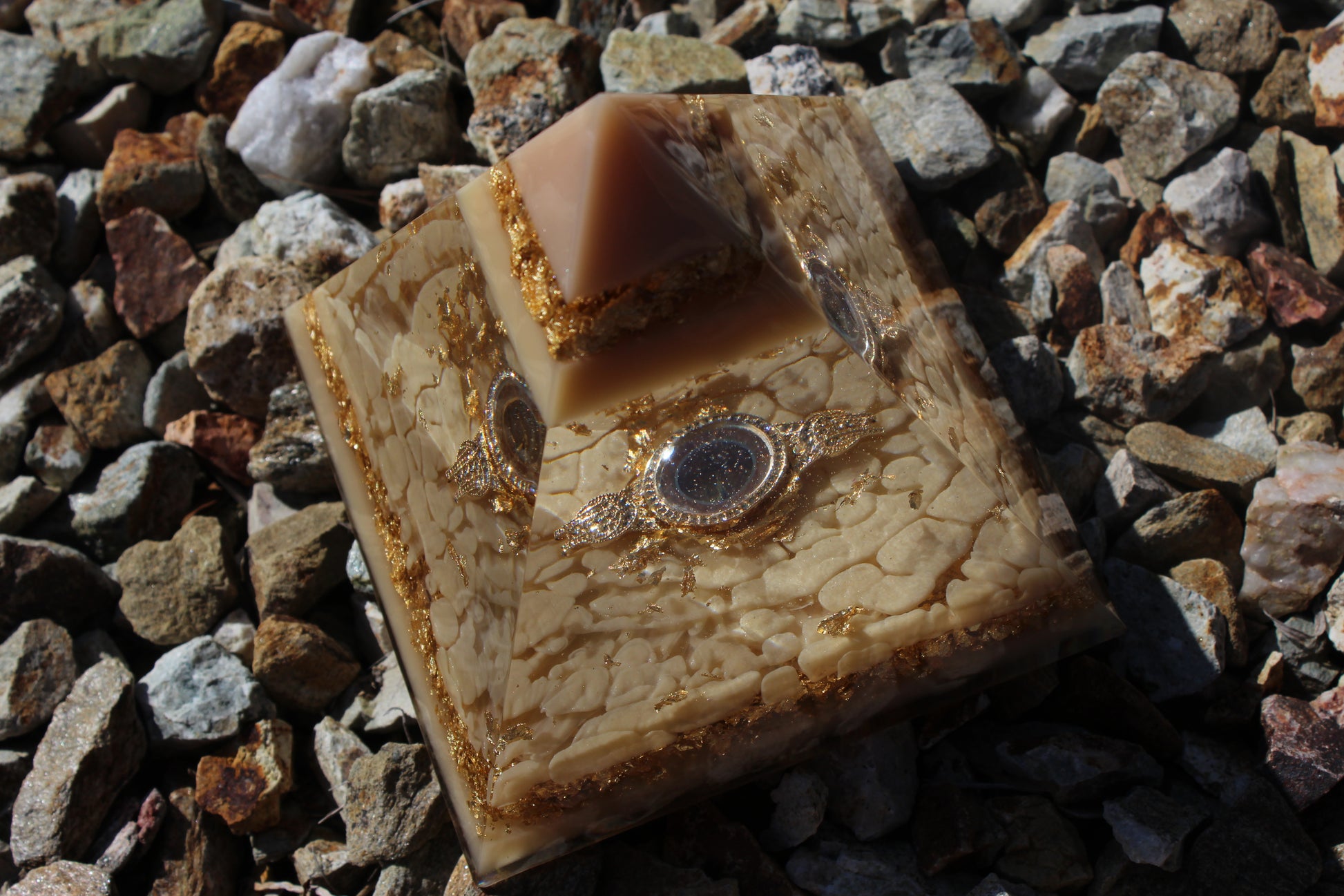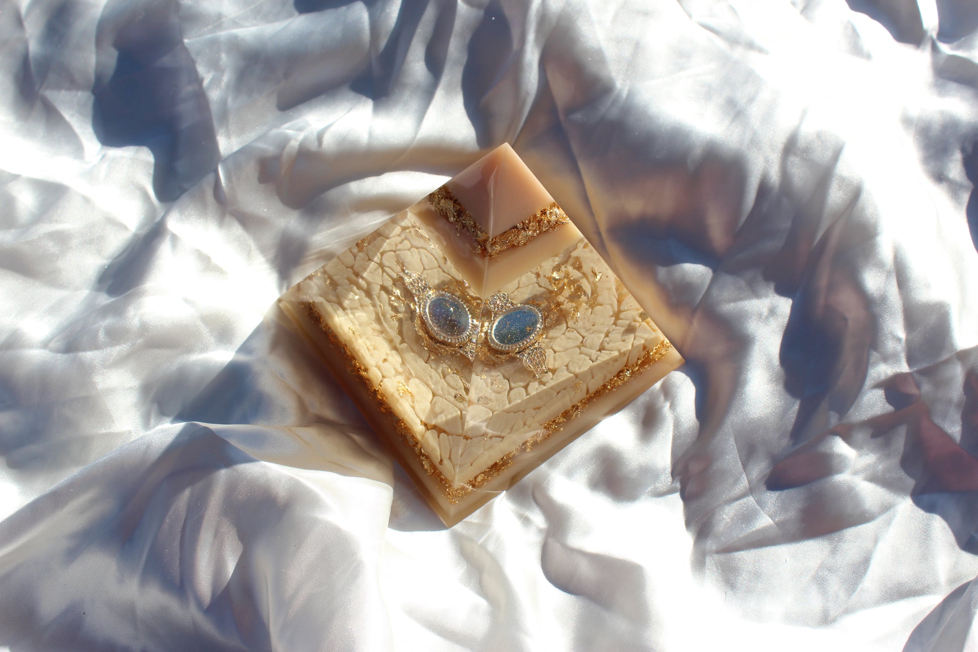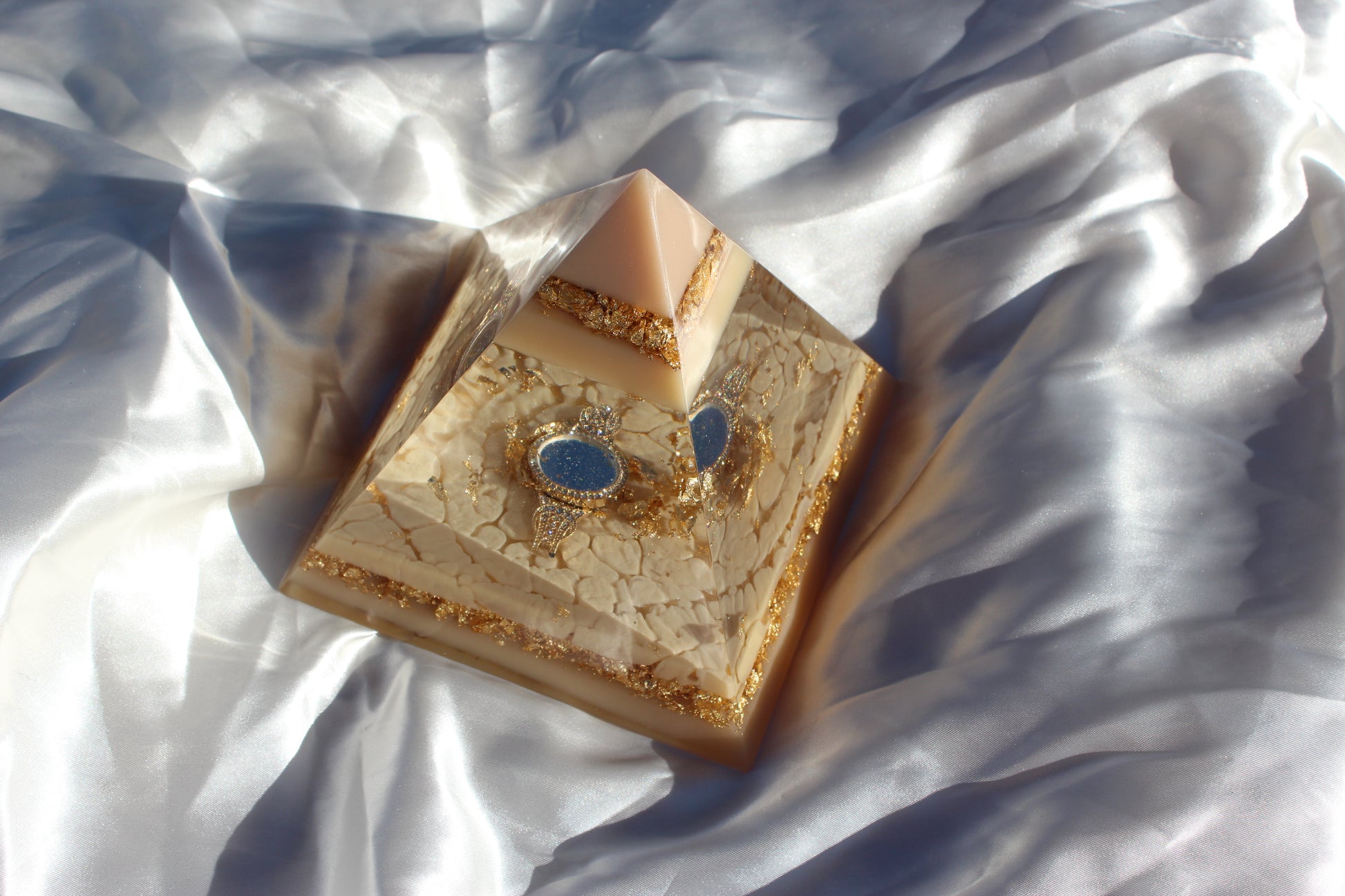 Champagne Poetry II is another addition to our signature Resin Pyramid collection. This resin sculpture is crafted with layers of champagne-toned resin with subtle shimmer and gold foil accents. Each layer is designed to catch the light differently, creating depth and warmth. The centerpiece of this pyramid is a champagne-colored watch, embedded as a functional element and design feature. The watch face is only visible at certain angles, revealing itself gradually as you move around the piece. This intentional detail plays with perspective, time, and presence.