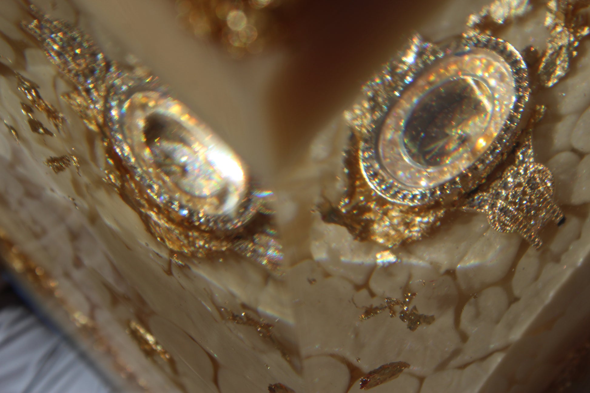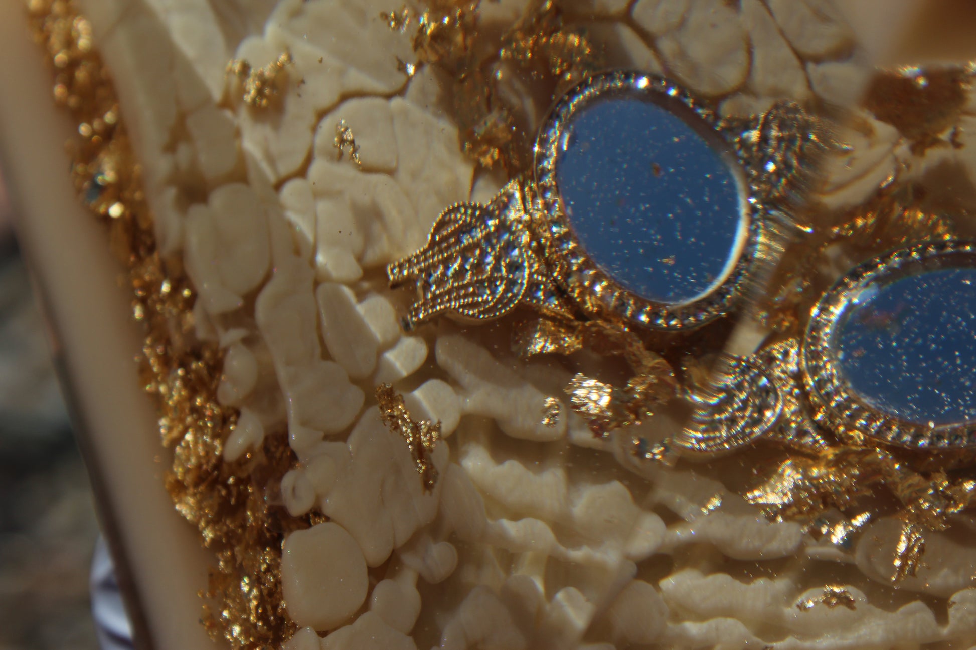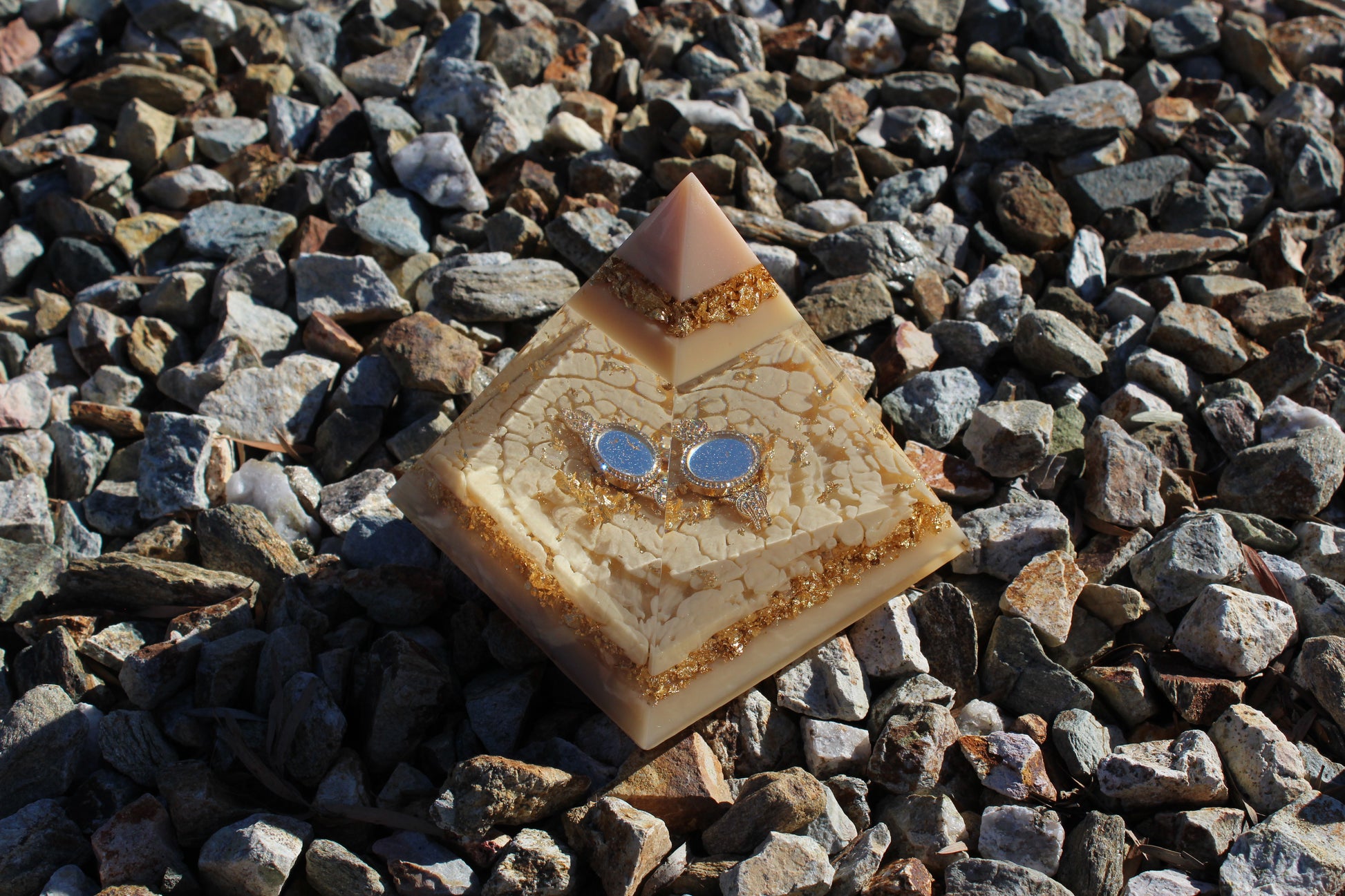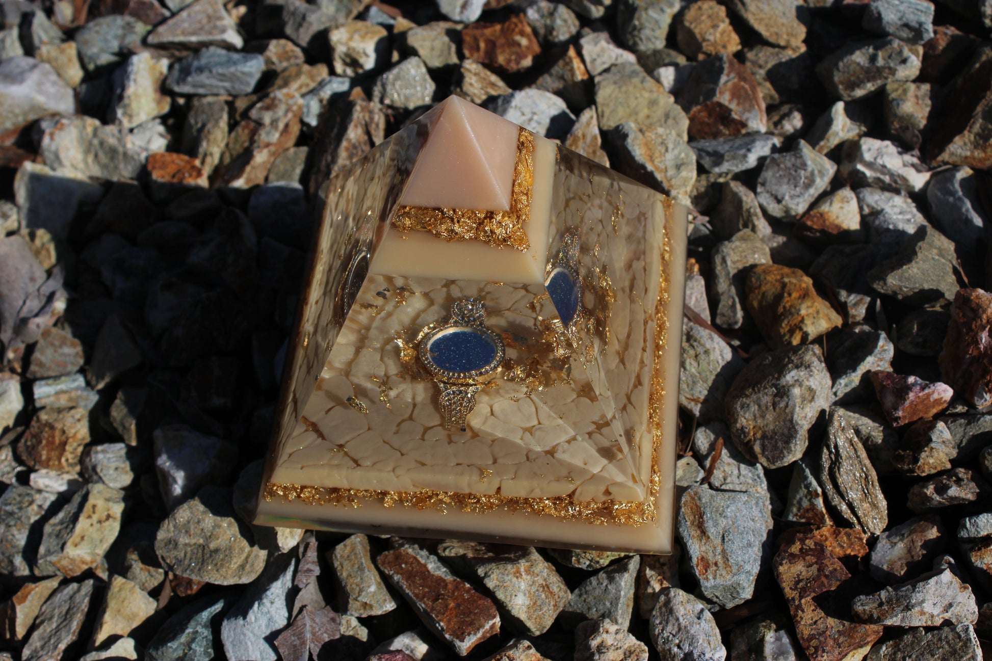Champagne Poetry II is another addition to our signature Resin Pyramid collection. This resin sculpture is crafted with layers of champagne-toned resin with subtle shimmer and gold foil accents. Each layer is designed to catch the light differently, creating depth and warmth. The centerpiece of this pyramid is a champagne-colored watch, embedded as a functional element and design feature. The watch face is only visible at certain angles, revealing itself gradually as you move around the piece. This intentional detail plays with perspective, time, and presence.