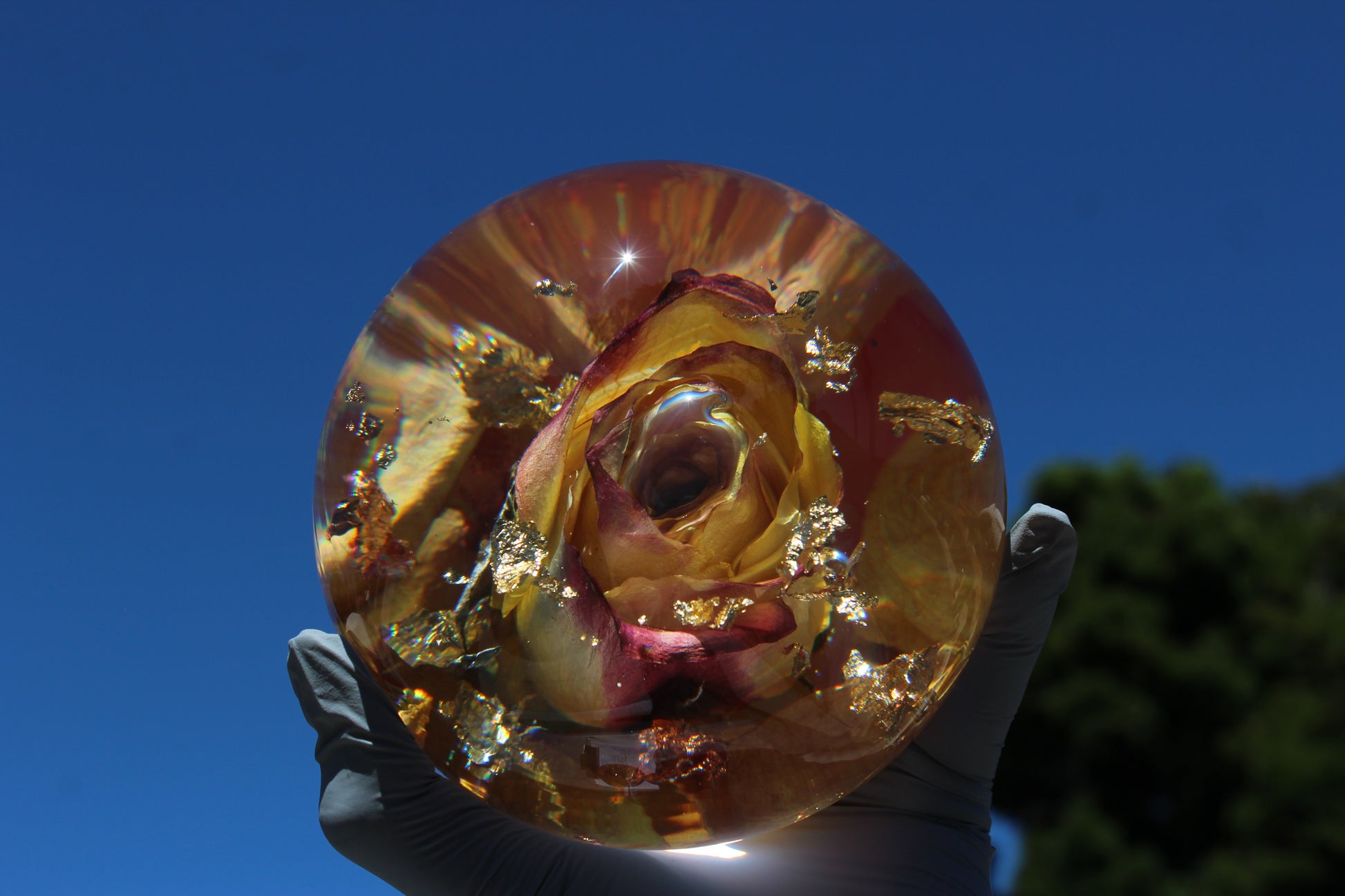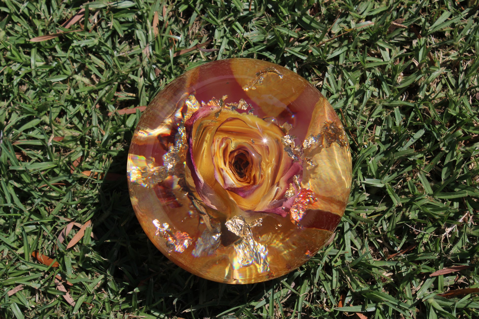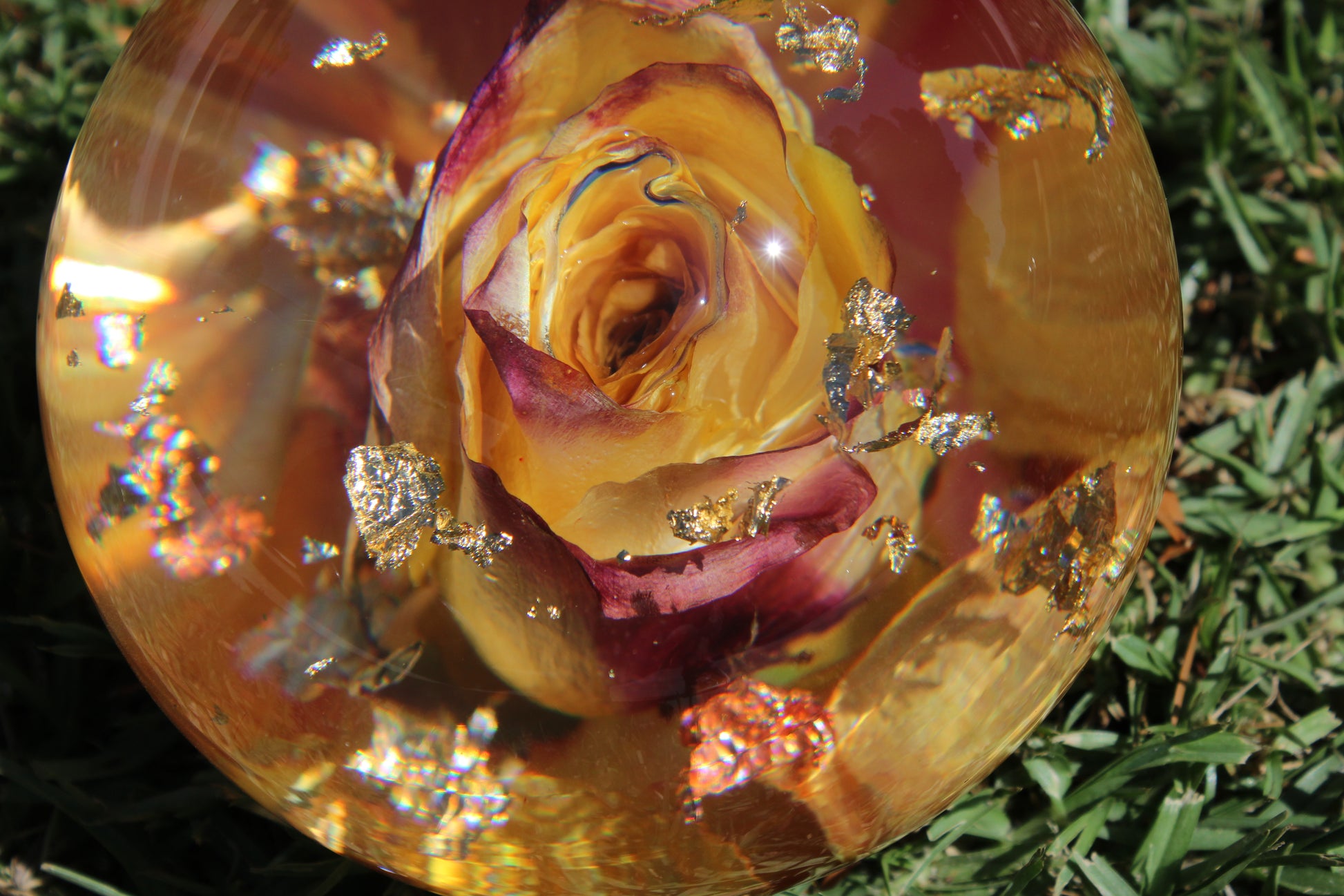 The surface is smooth and round with a flat base, so it sits beautifully wherever you place it. Gold foil threads through the colors like sunlight catching a glass — subtle but unforgettable. Every single piece I make is unique, so no two gumballs are ever exactly the same.