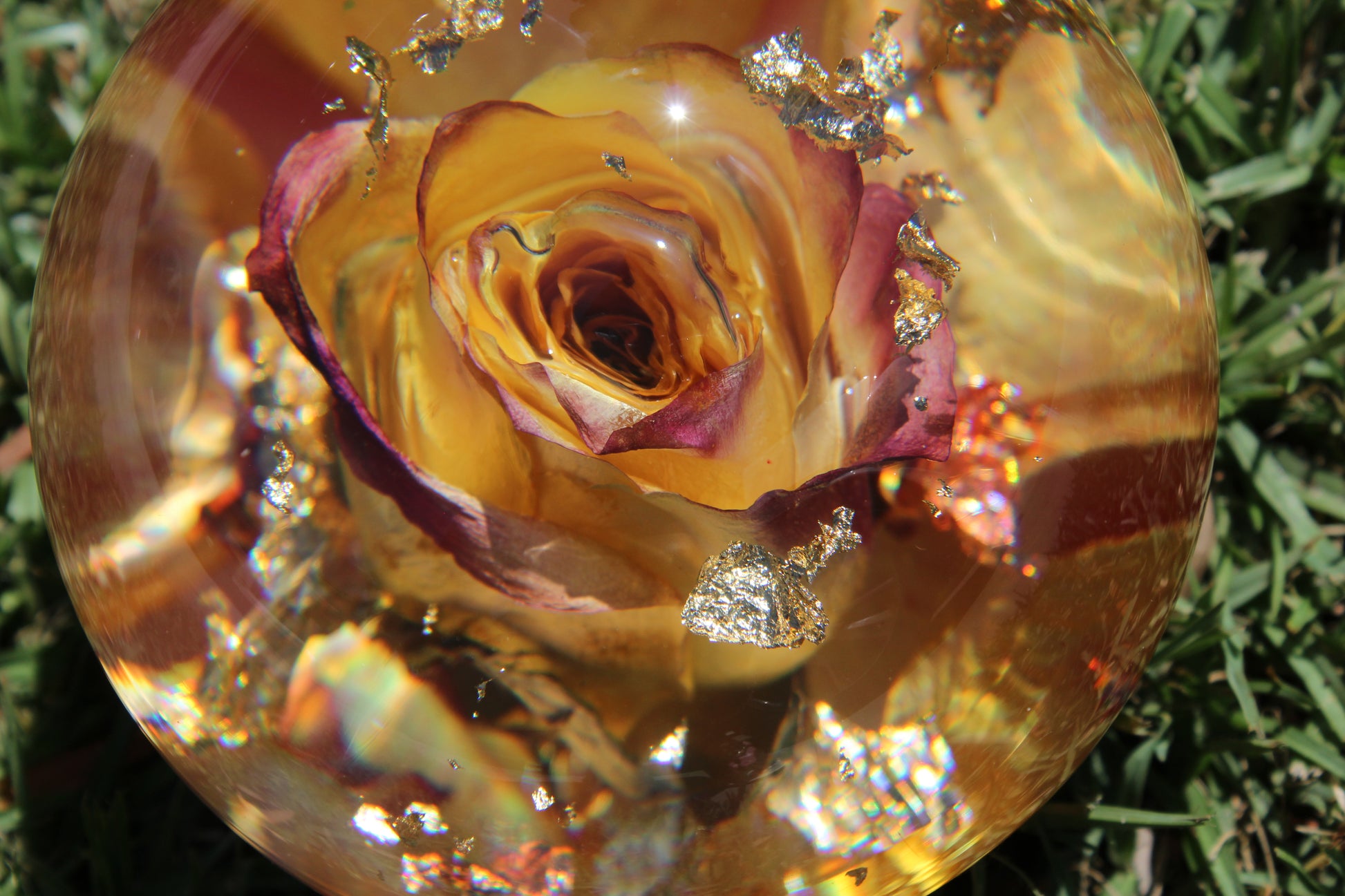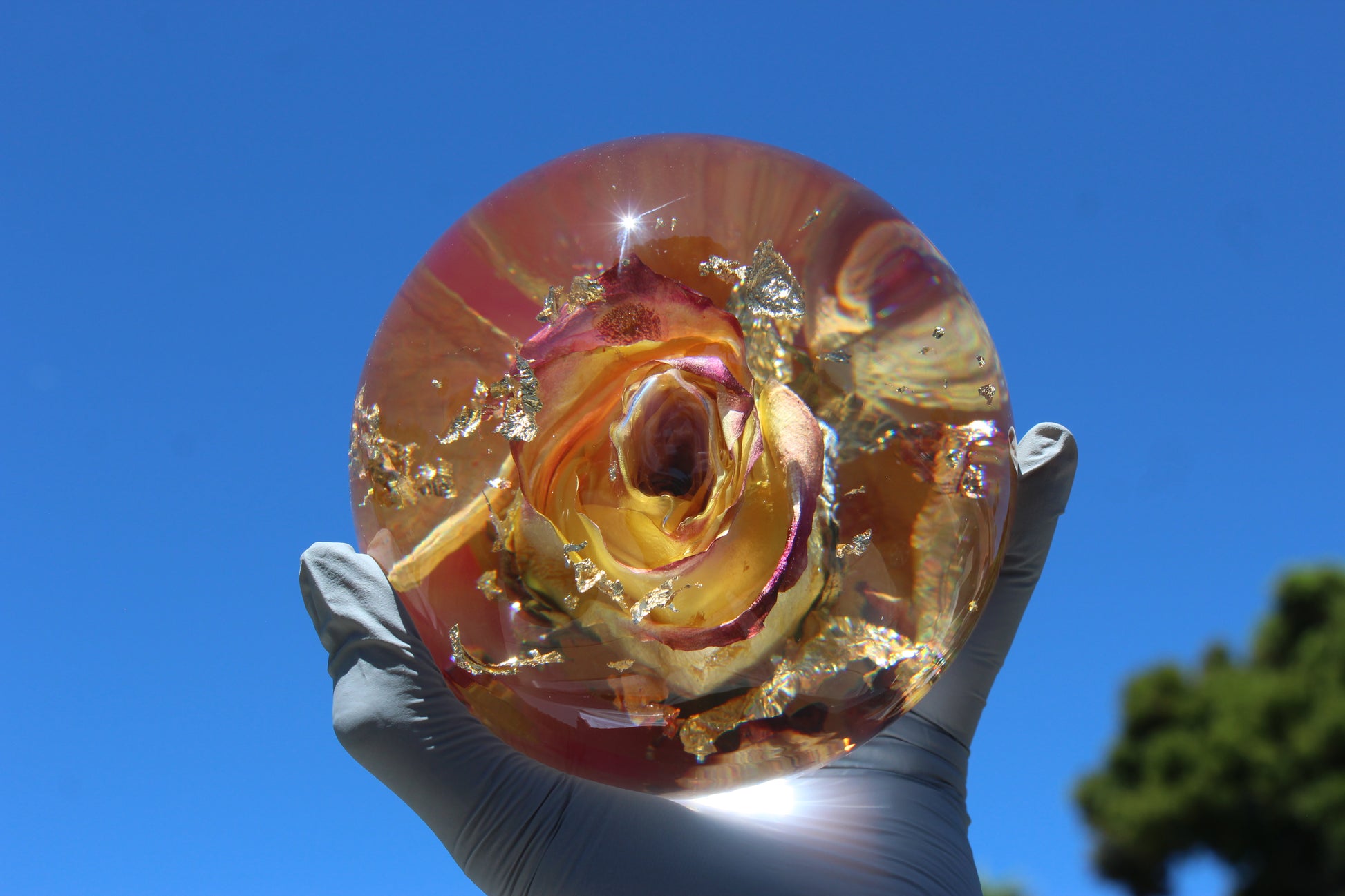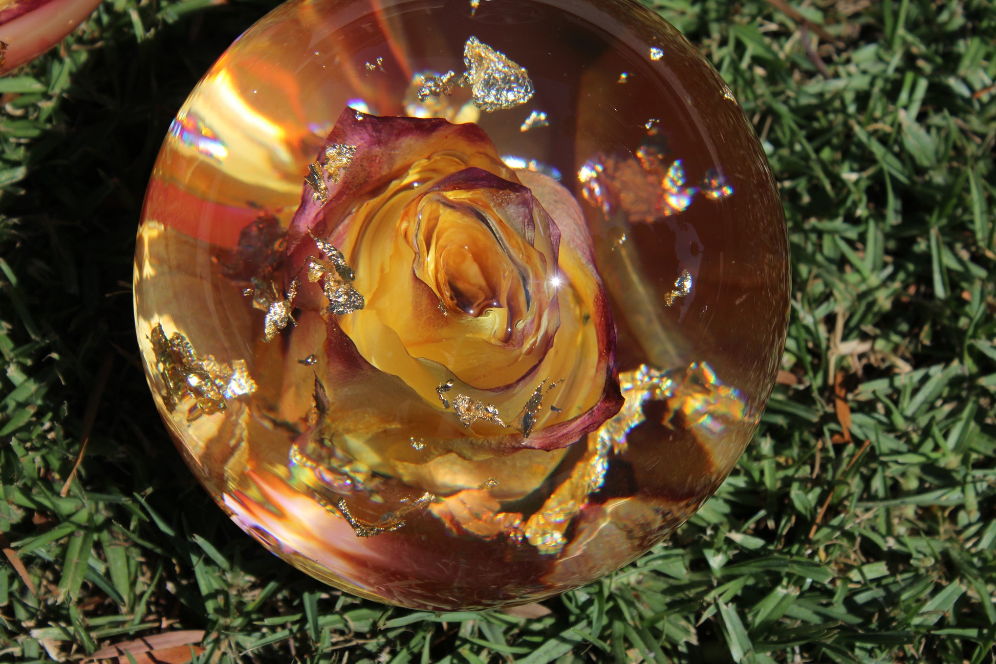 The surface is smooth and round with a flat base, so it sits beautifully wherever you place it. Gold foil threads through the colors like sunlight catching a glass — subtle but unforgettable. Every single piece I make is unique, so no two gumballs are ever exactly the same.